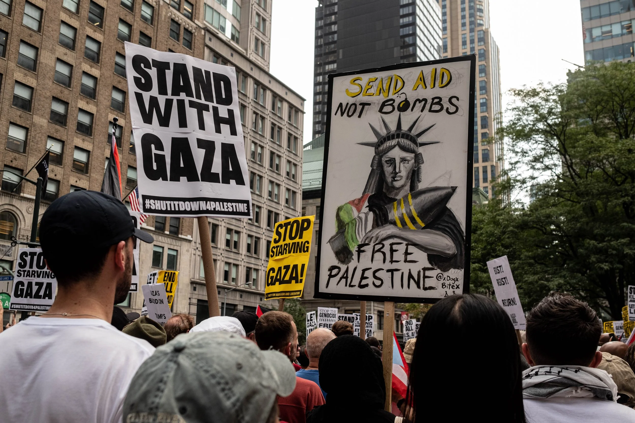 Protesters hold a hand-drawn sign of the Statue of Liberty cradling a bomb with the message "SEND AID NOT BOMBS," alongside placards demanding "STAND WITH GAZA."