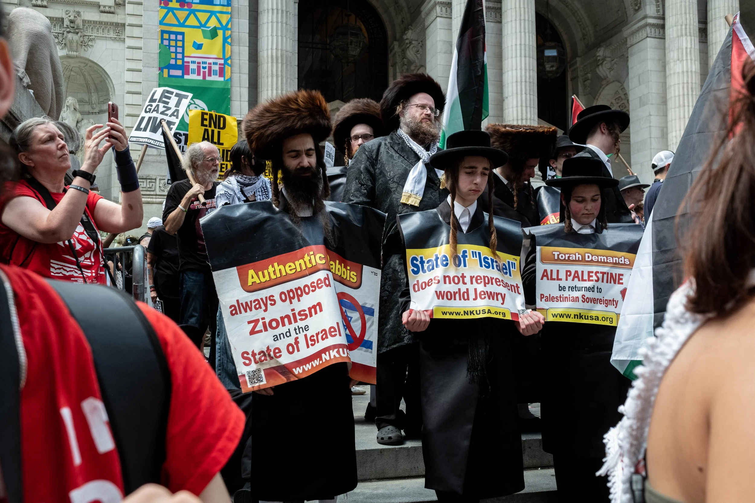 A group of Orthodox Jewish men on the library steps hold signs stating that authentic Rabbis have always opposed Zionism and that the State of Israel does not represent world Jewry.