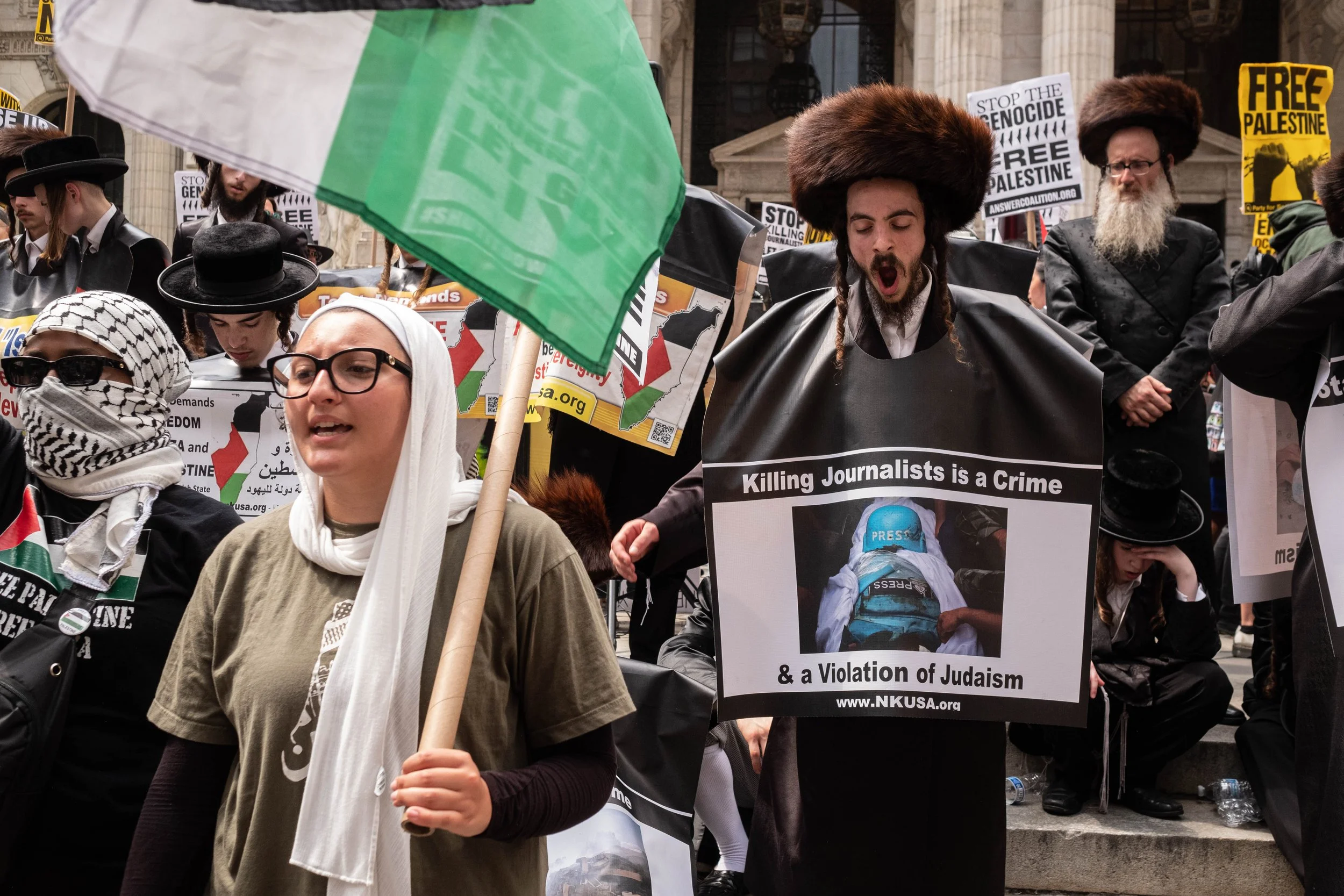 An Orthodox Jewish man in a shtreimel shouts while wearing a banner that declares "Killing Journalists is a Crime & a Violation of Judaism," featuring an image of a deceased journalist in a blue press vest.