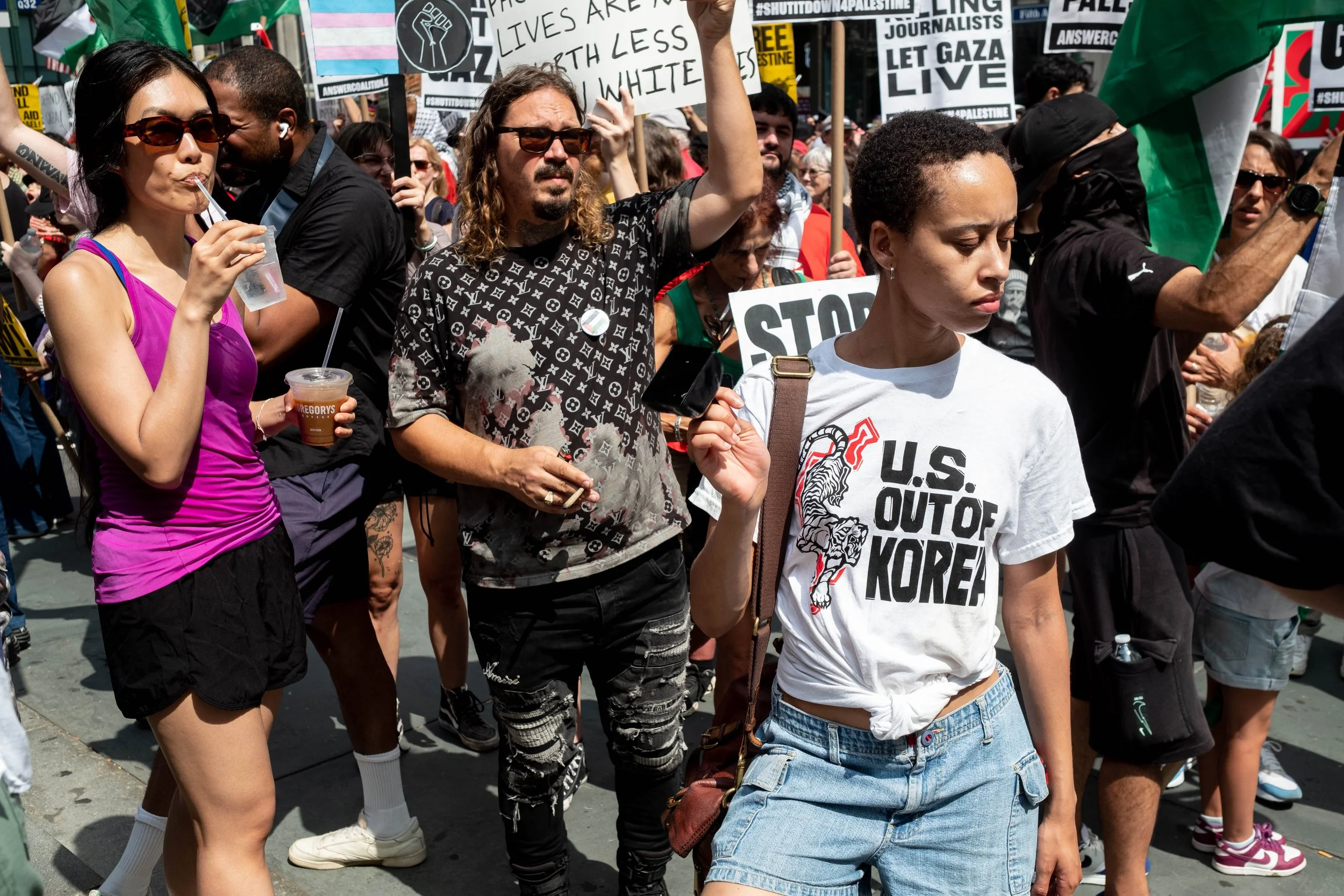 A woman in a "U.S. OUT OF KOREA" t-shirt walks through the crowd, while a woman in a purple tank top drinks from a cup and other protesters hold signs behind them.