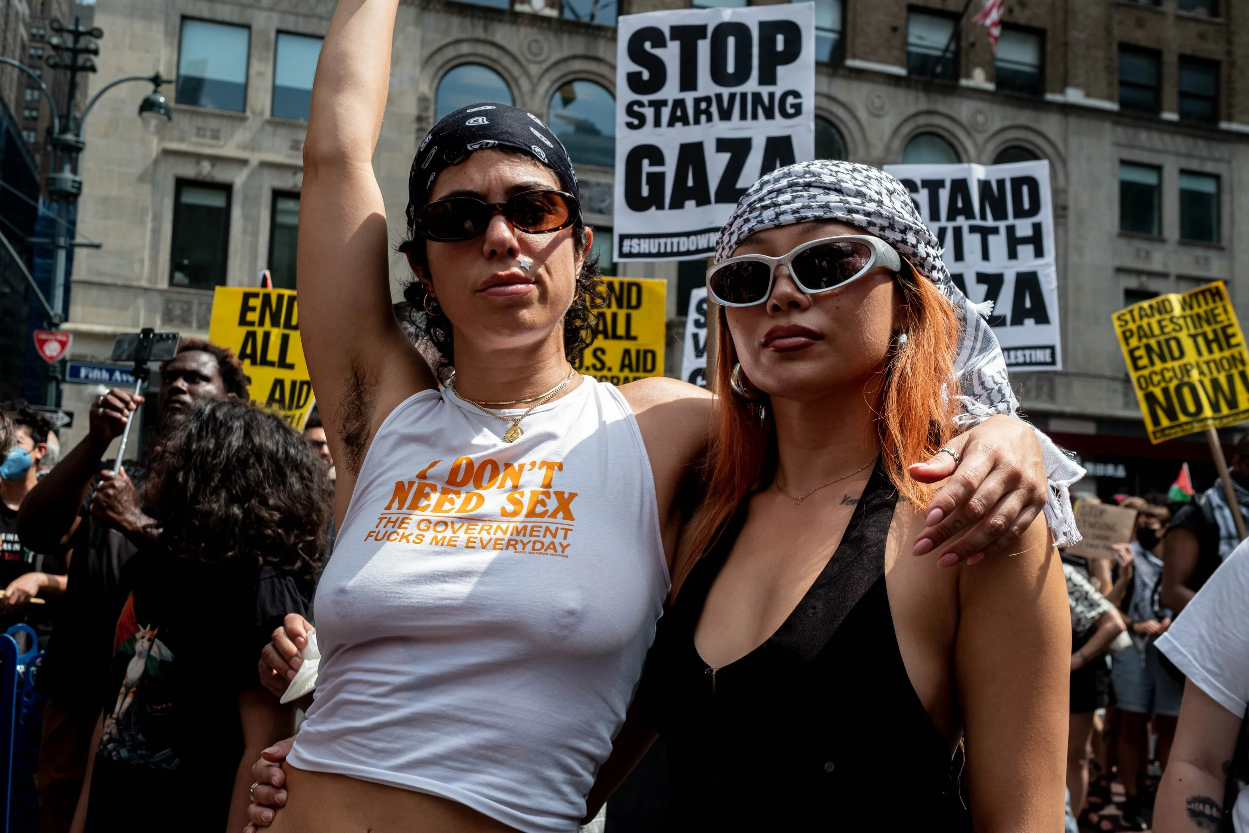 Two young women in sunglasses embrace amid the protest; one wears a white t-shirt with text criticizing the government, while "STOP STARVING GAZA" signs rise in the background.