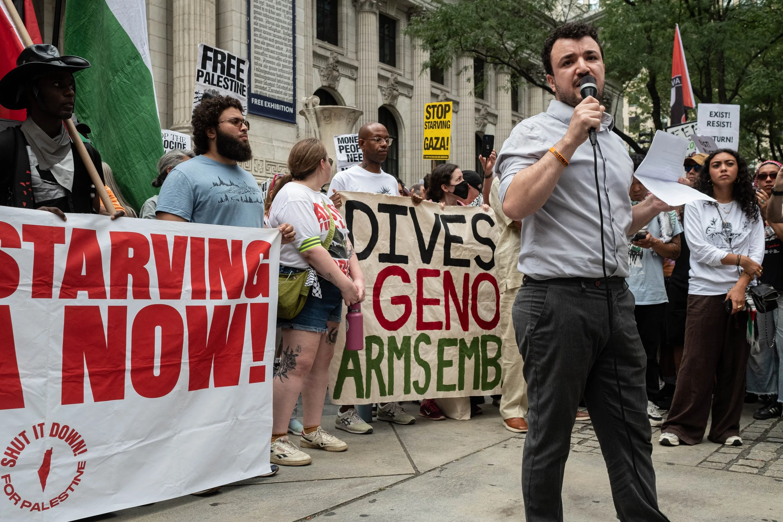 Holding a microphone and his notes, activist Mahmoud Khalil addresses the crowd in front of large banners demanding an end to starvation in Gaza and an arms embargo.
