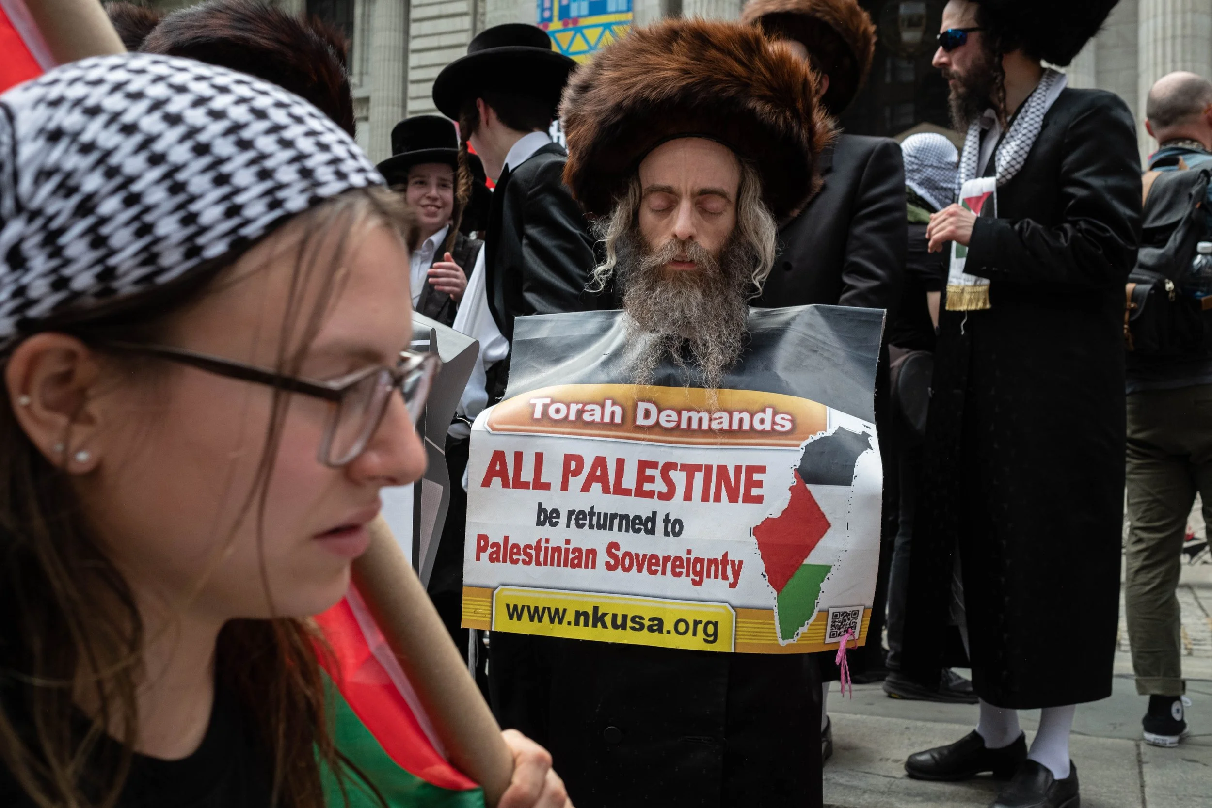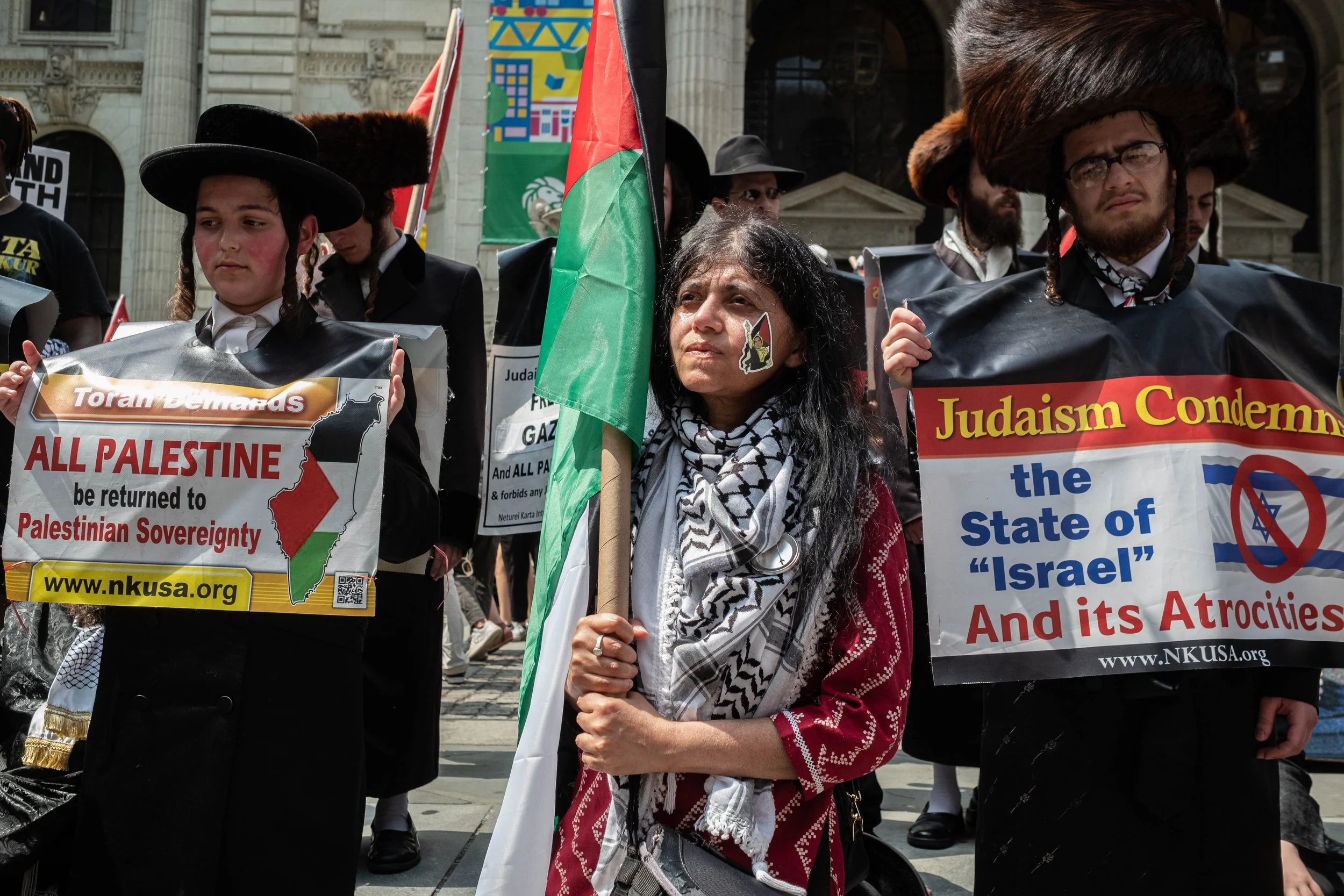 A woman with a Palestinian flag sticker on her cheek stands between two Orthodox Jewish men. Their signs declare that the Torah demands all Palestine be returned to Palestinian sovereignty and that Judaism condemns the State of Israel.
