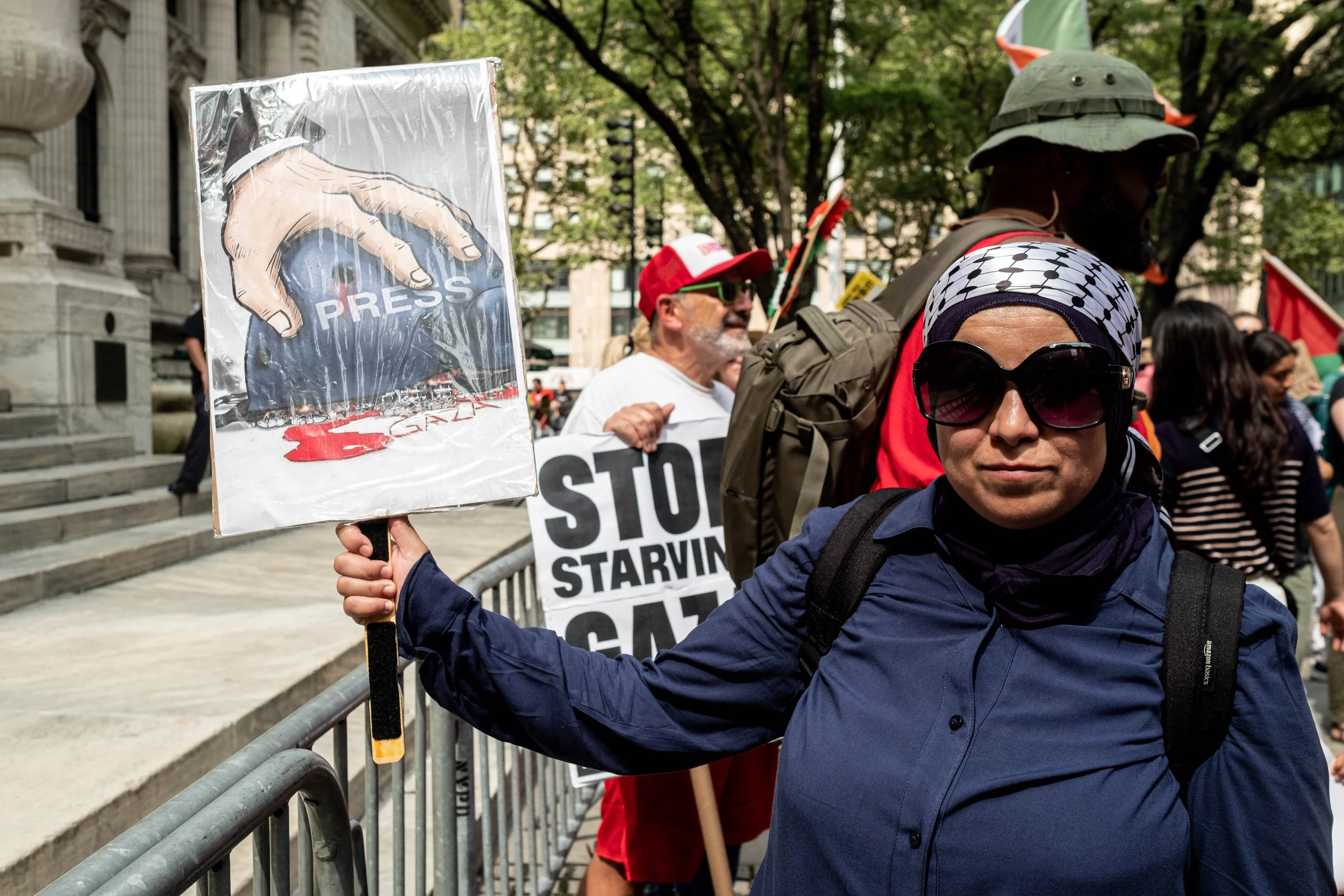Wearing a keffiyeh and sunglasses, Muna holds a graphic sign depicting a hand crushing a press helmet as a pool of blood forms the word "GAZA."