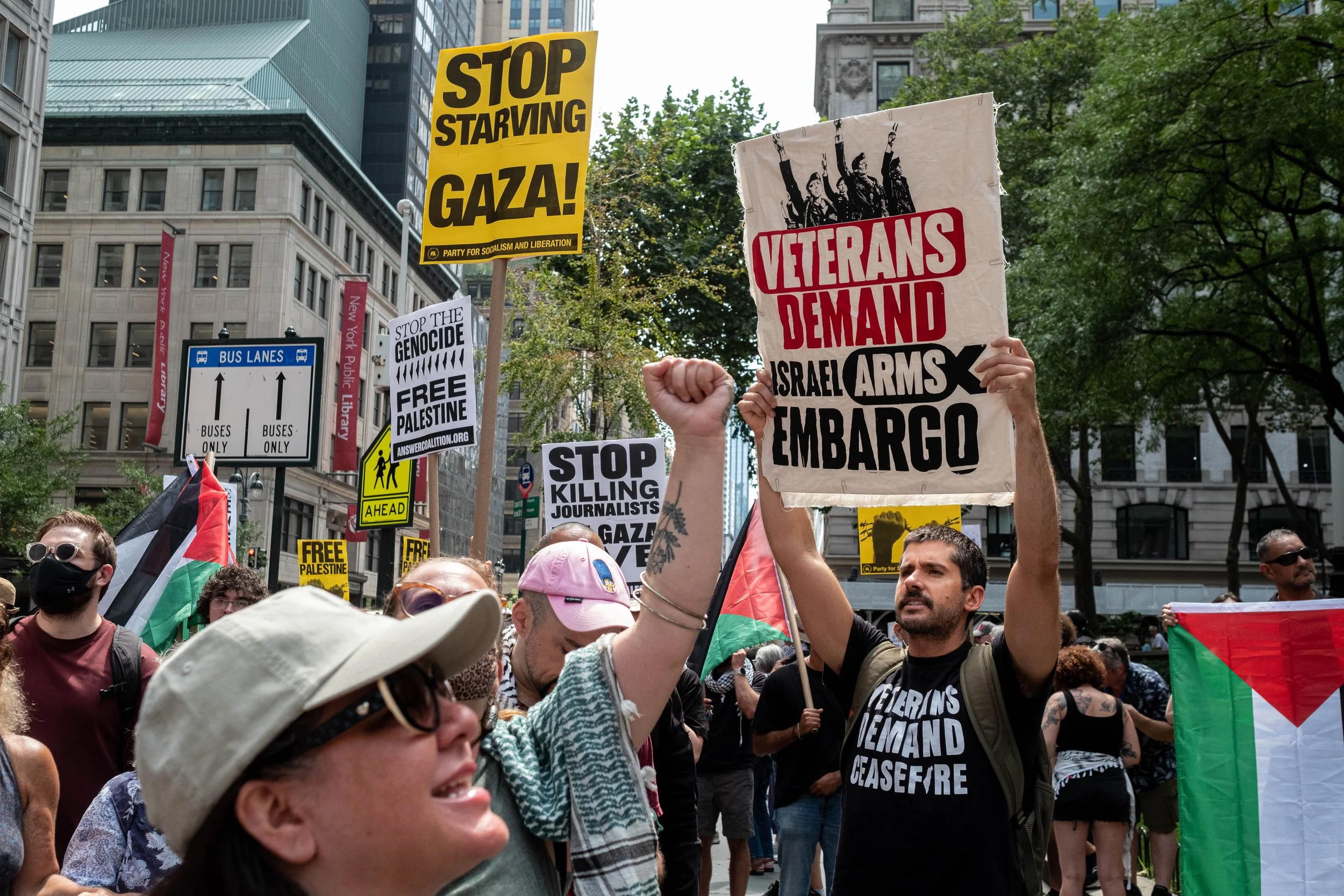 A man in a "Veterans Demand Ceasefire" shirt holds a sign calling for an arms embargo on Israel, while another protester raises a fist in front of "Stop Starving Gaza" posters.