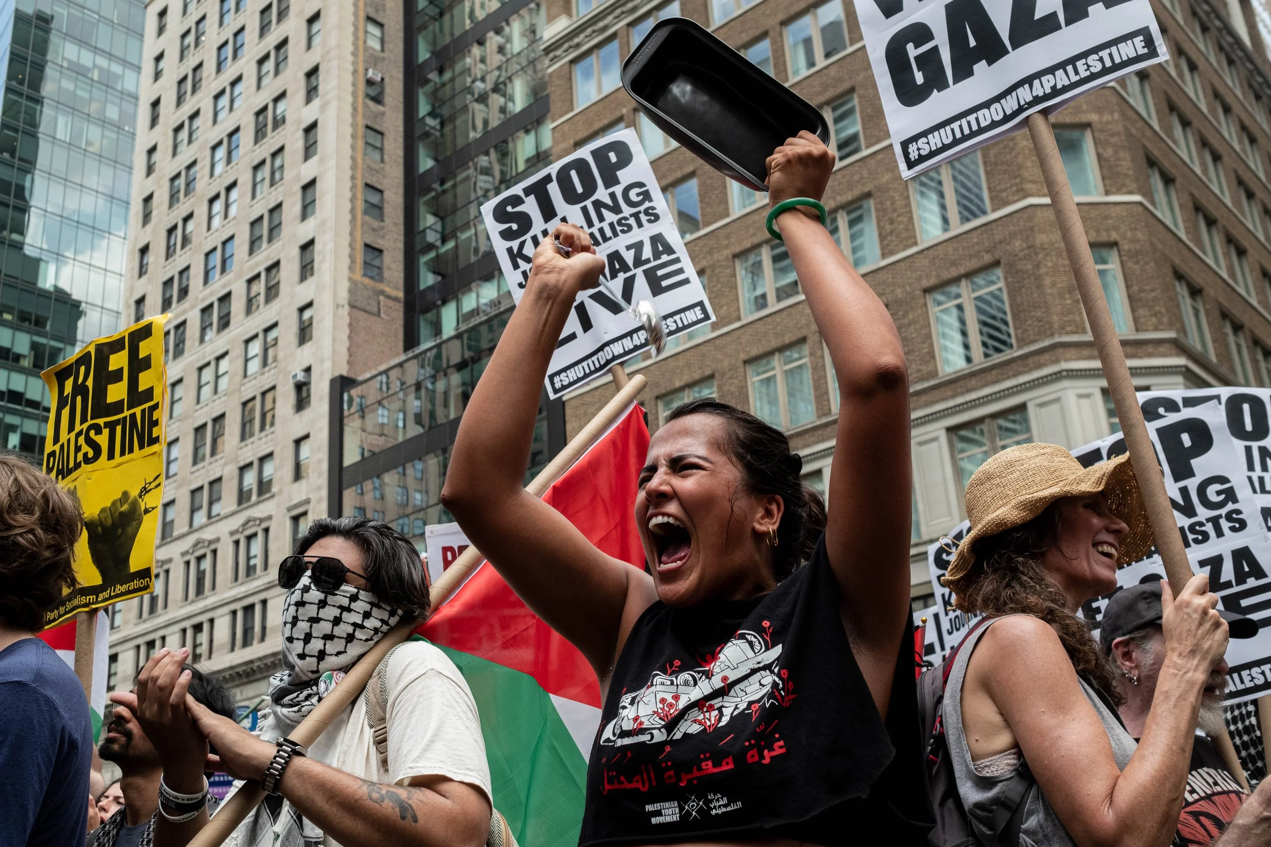 Raising an empty baking pan as a symbol of starvation, a woman shouts in protest among signs that demand "FREE PALESTINE," "STOP KILLING JOURNALISTS,” and “LET GAZA LIVE."