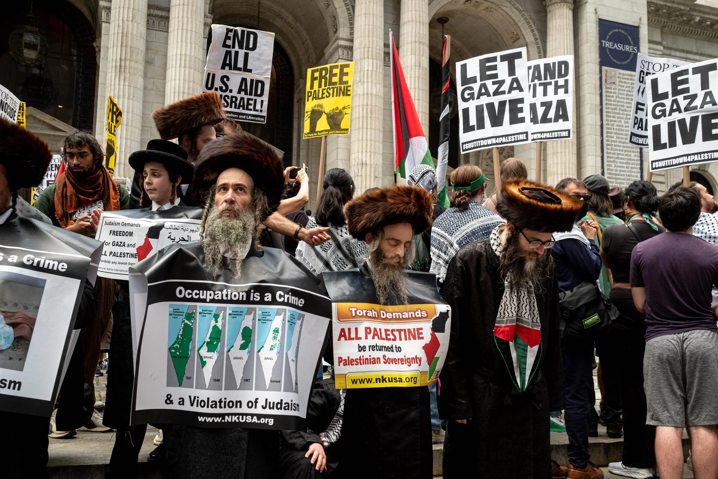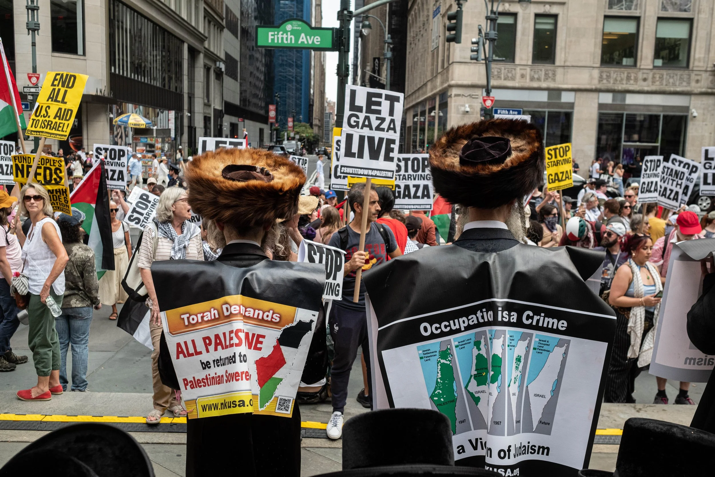 Orthodox Jewish men stand with signs calling the occupation a violation of Judaism and demanding all Palestine be returned to Palestinian sovereignty, while others hold "LET GAZA LIVE" posters.