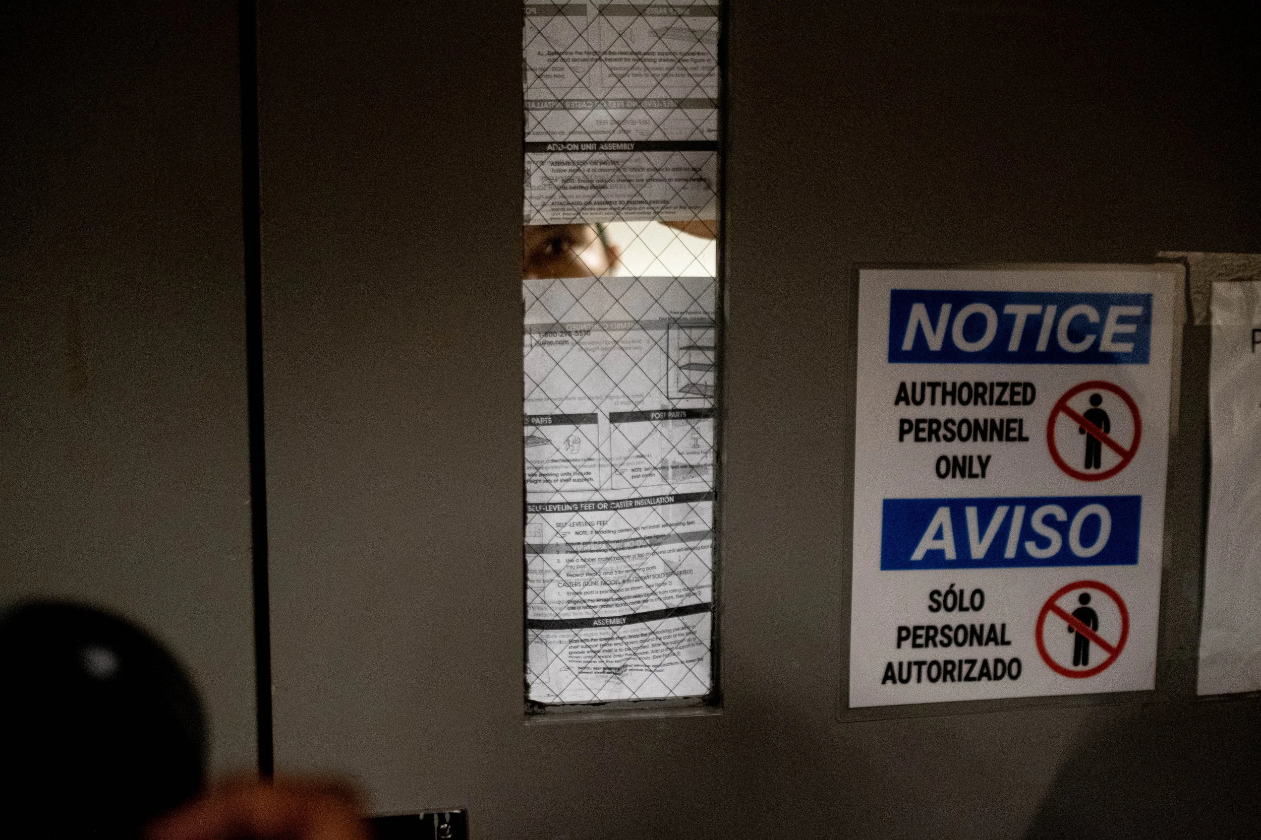 The physical barrier is captured in detail: a narrow, reinforced window in the door, covered with a protective mesh and taped-up documents that obscure the view of the facility's interior. To the right, a prominent sign reinforces the restriction, stating "AUTHORIZED PERSONNEL ONLY" in both English and Spanish.