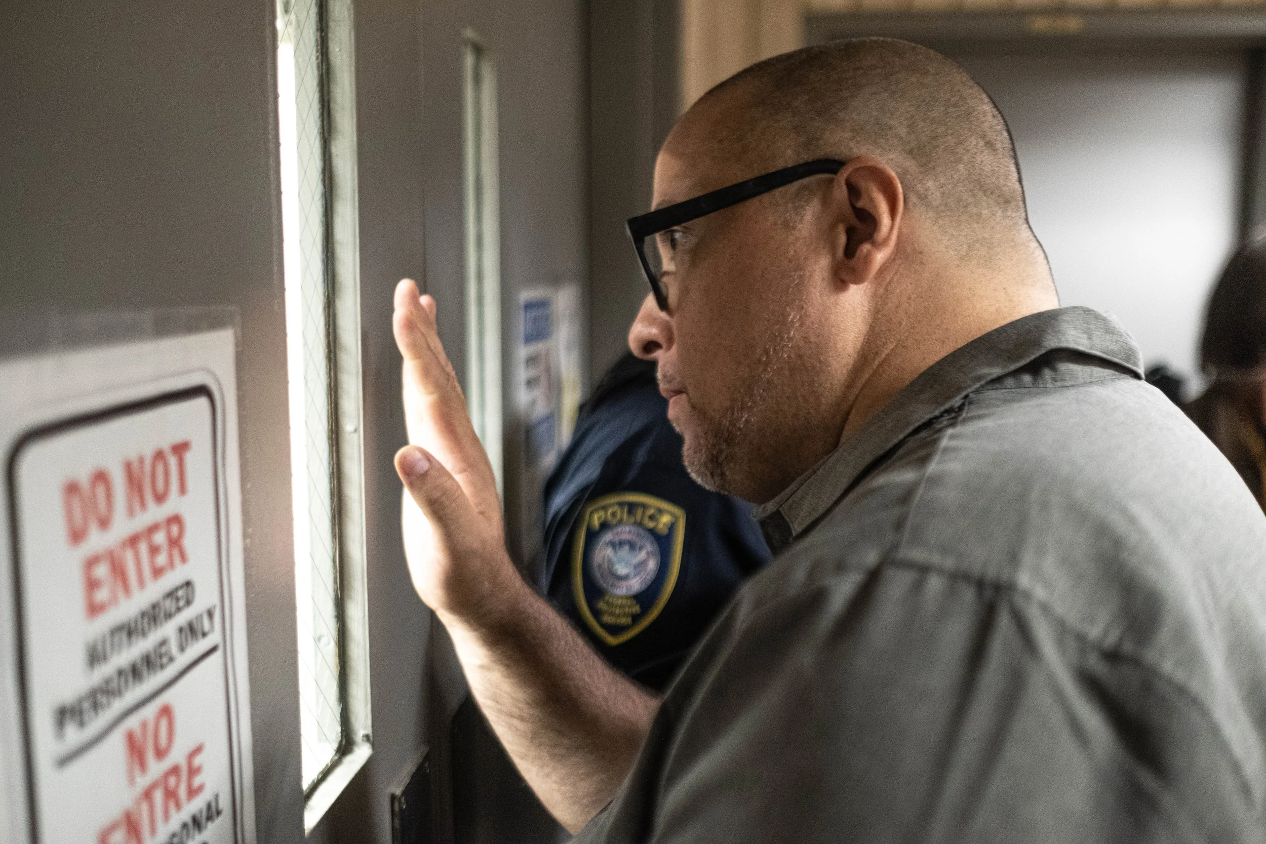 State Senator Gustavo Rivera peers through a narrow window in the reinforced door of the 10th-floor facility. A "DO NOT ENTER" sign and the presence of a security officer underscore the physical and bureaucratic barriers preventing the officials from accessing the detention area.
