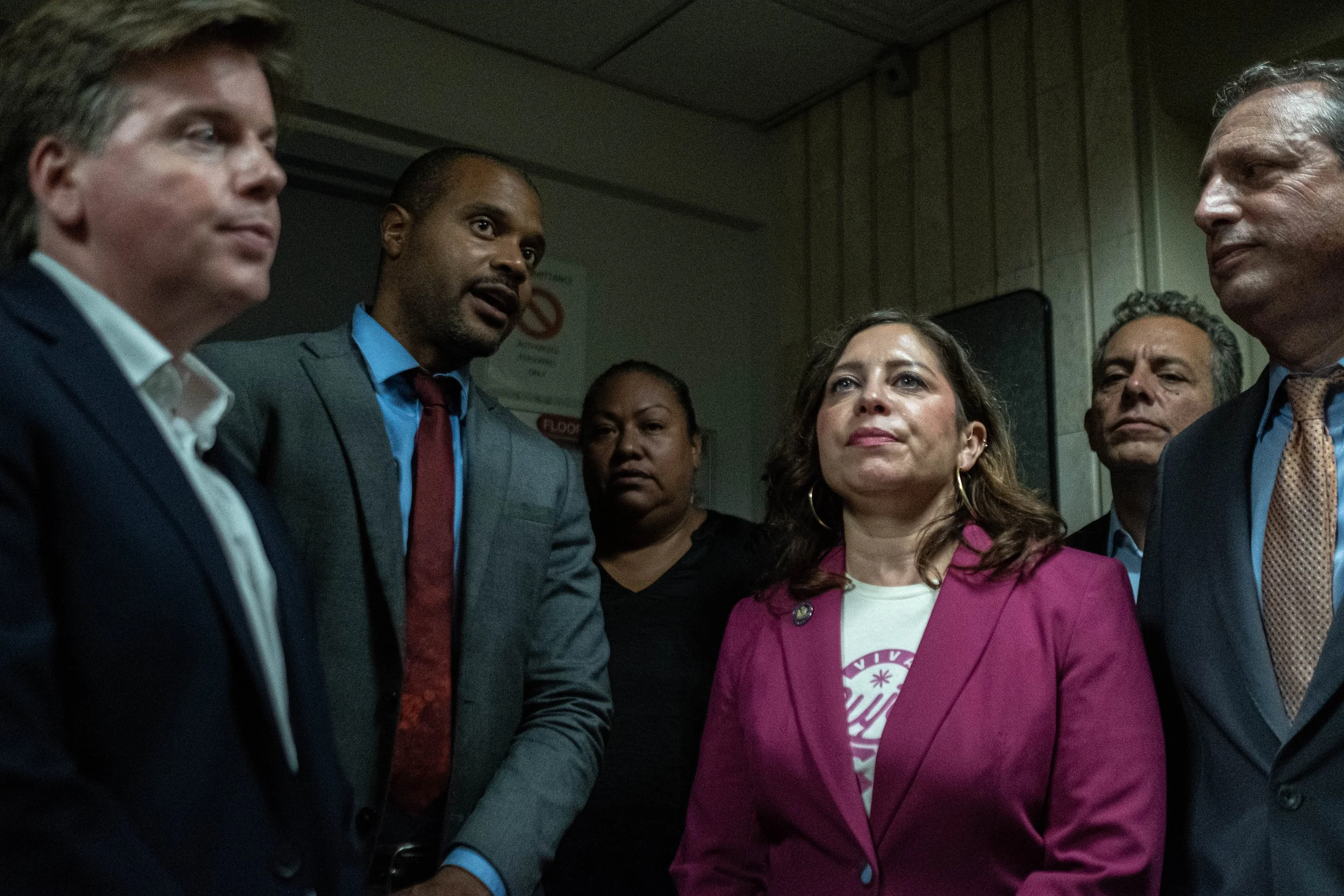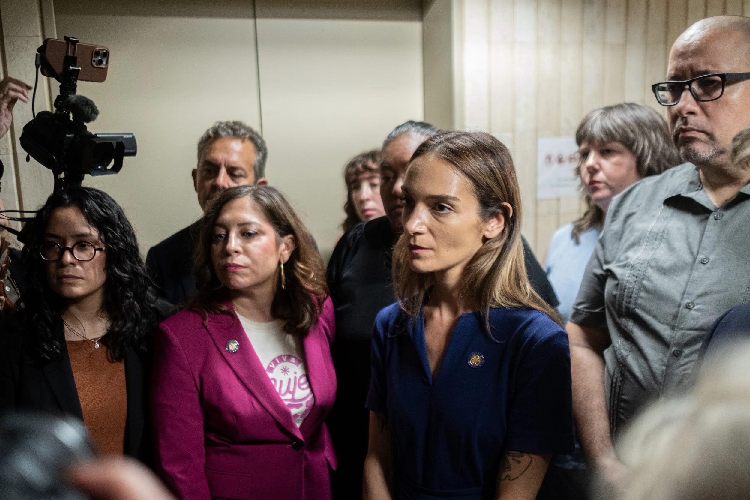 Assembly Members Jessica González-Rojas and Emily Gallagher stand before the elevators at 26 Federal Plaza. Their presence at the threshold of the 10th floor signals the start of the delegation's attempt to confront federal authorities regarding detention conditions.
