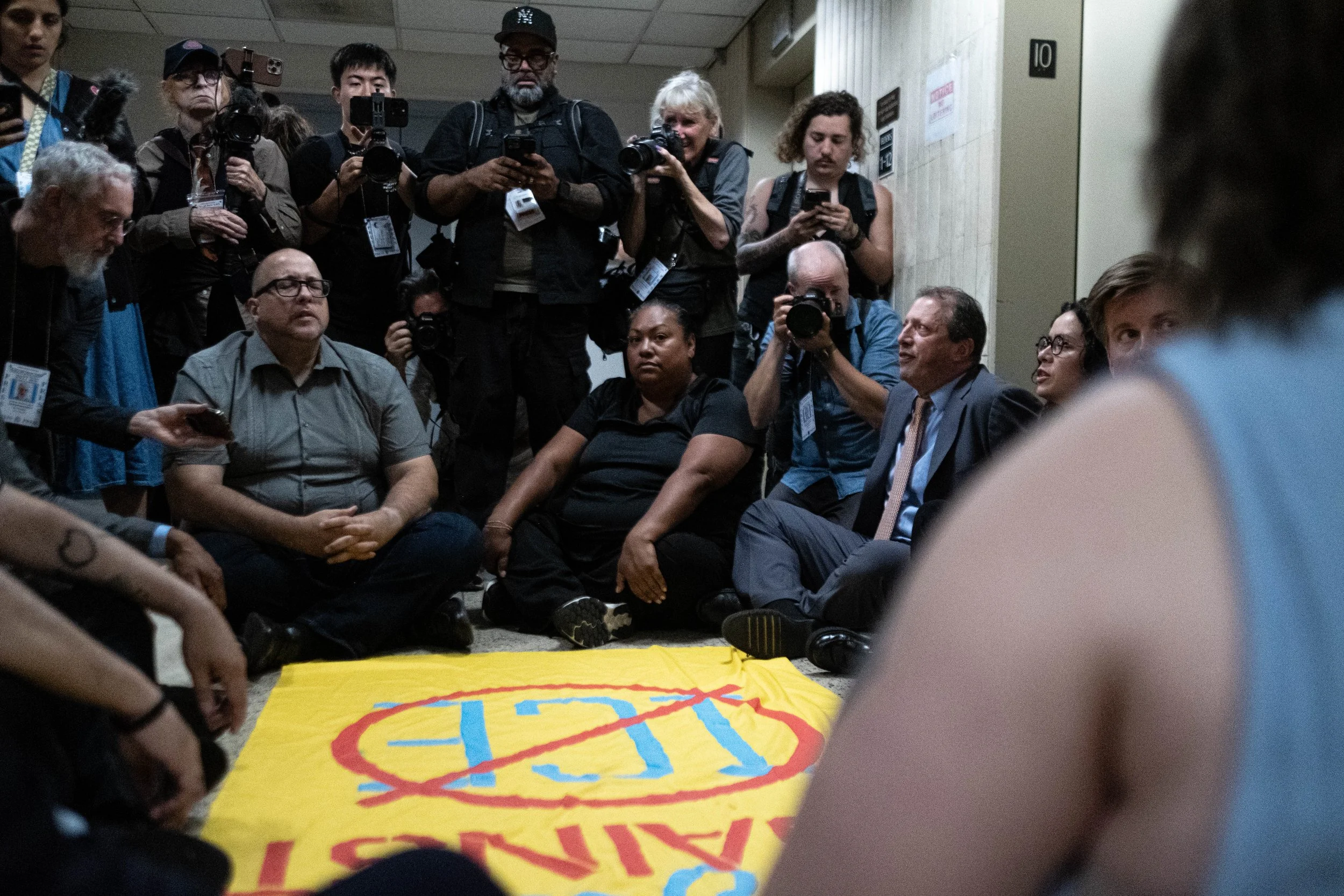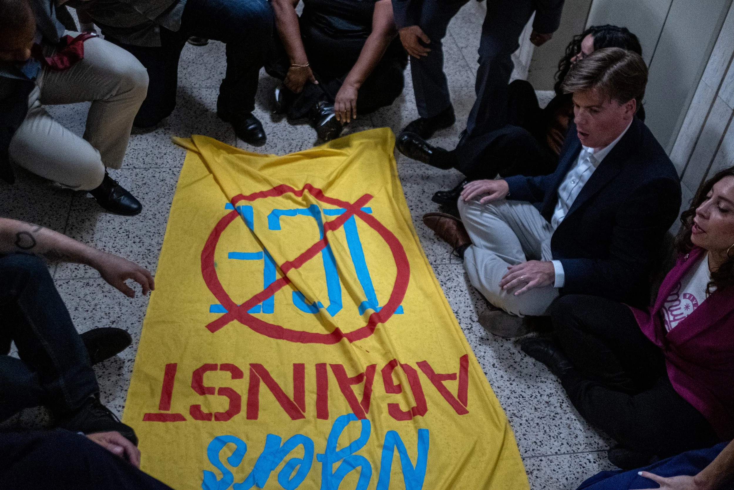 Members of the delegation and advocates sit on the floor of the 10th-floor hallway, surrounding a yellow banner that reads "NYers AGAINST ICE." This sit-in marked the moment the officials shifted their strategy to active civil disobedience after being denied entry to the facility.