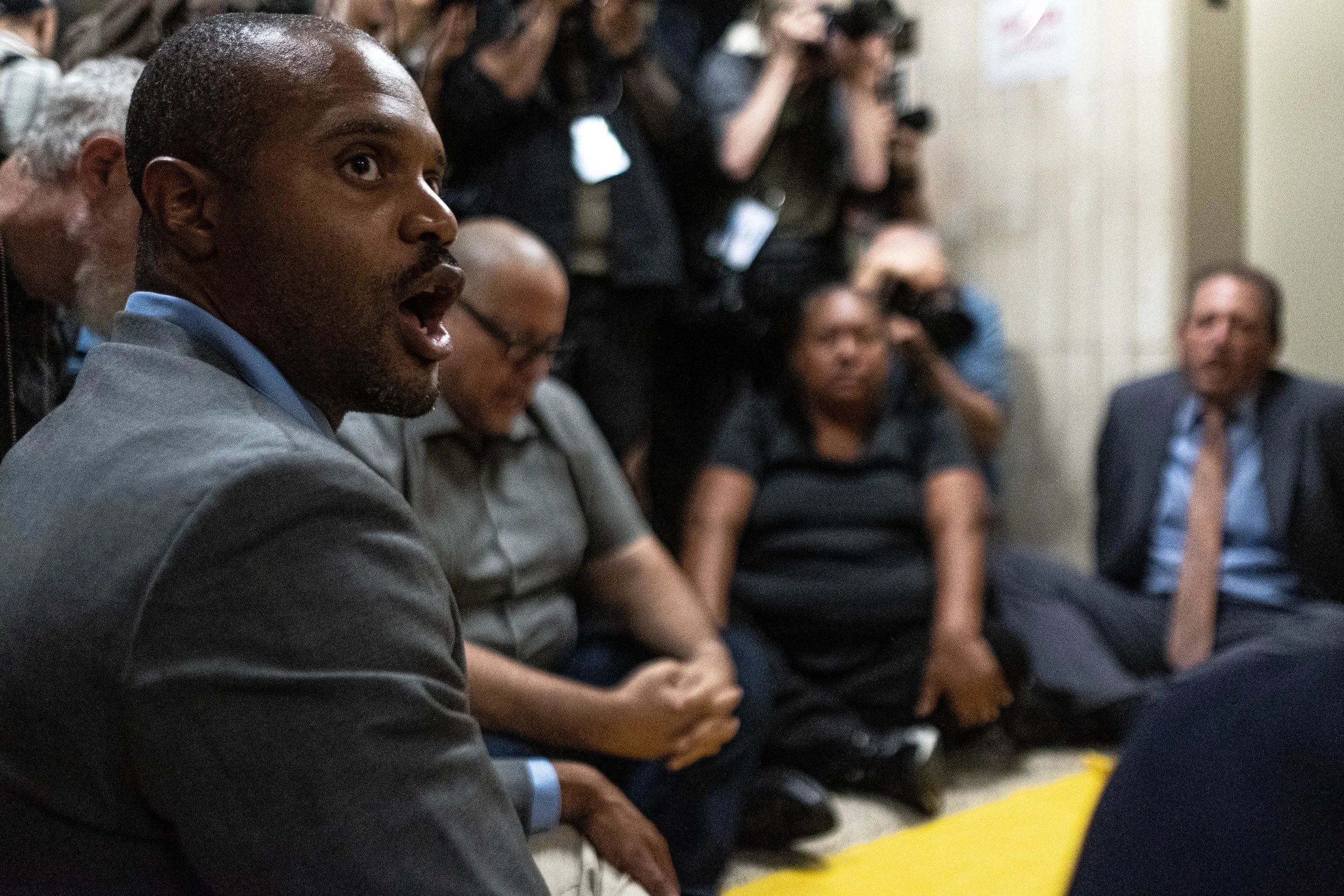 State Senator Jabari Brisport speaks out during the sit-in on the 10th floor. Behind him, Assembly Member Marcela Mitaynes and City Comptroller Brad Lander remain seated on the floor, joining the collective action to protest the lack of transparency and access to the federal facility.