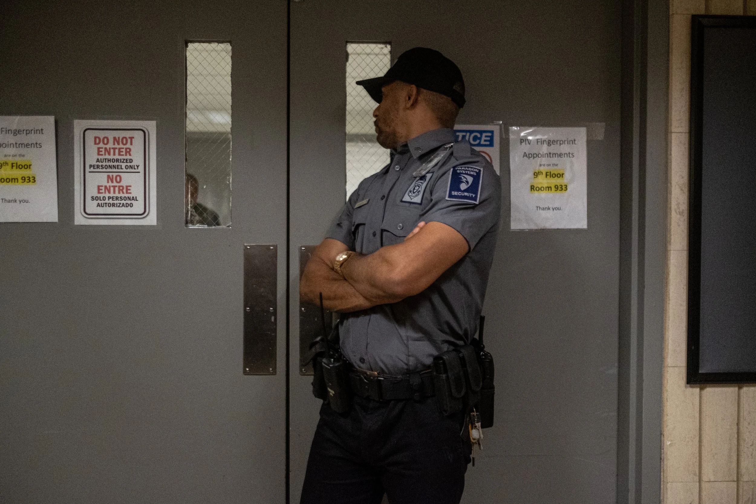 A private security officer from Paragon Systems stands with arms crossed, guarding the grey double doors of the facility. Signs posted on the entrance, including one stating "DO NOT ENTER - AUTHORIZED PERSONNEL ONLY," define the physical and bureaucratic barrier that triggered the officials’ sit-in protest.