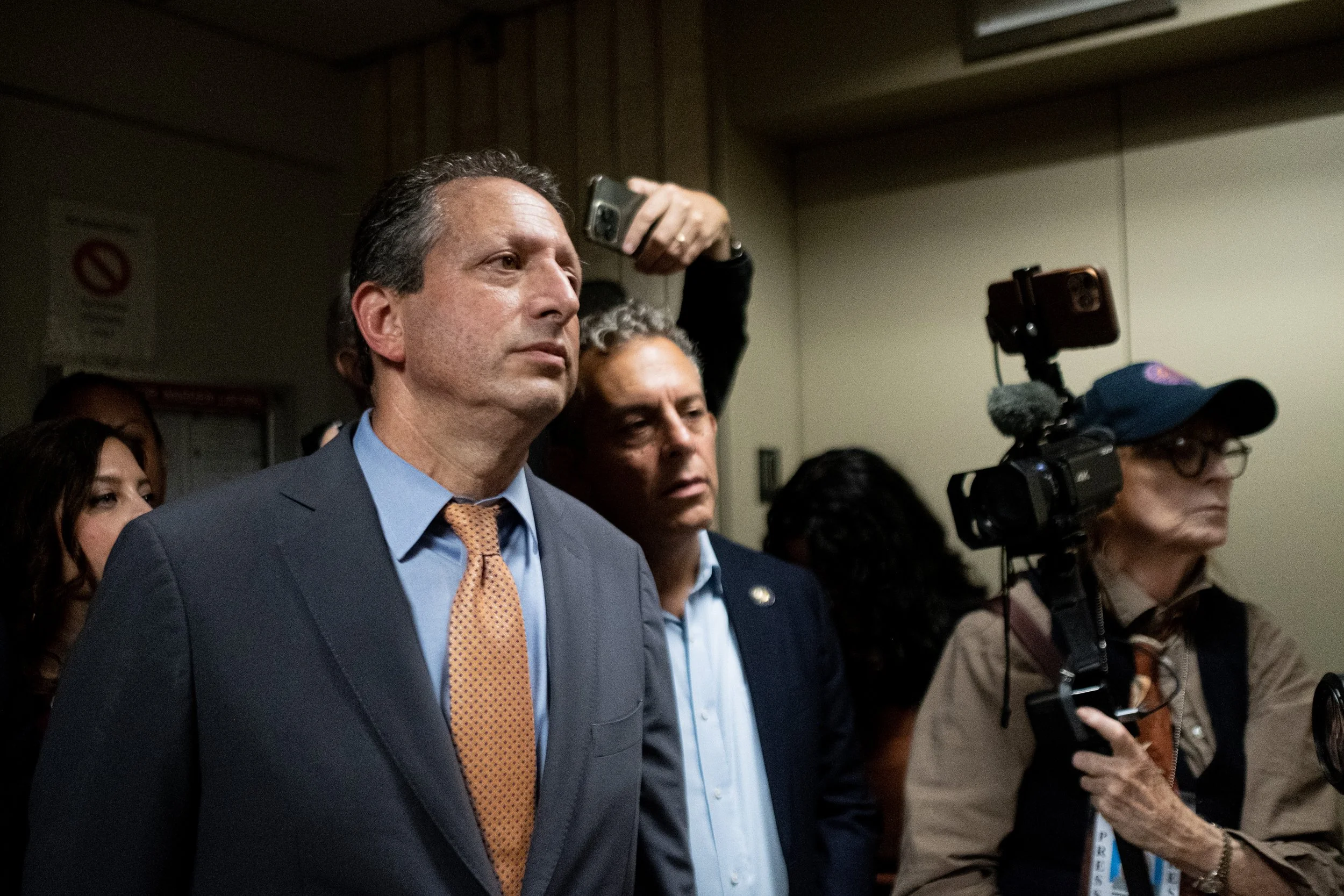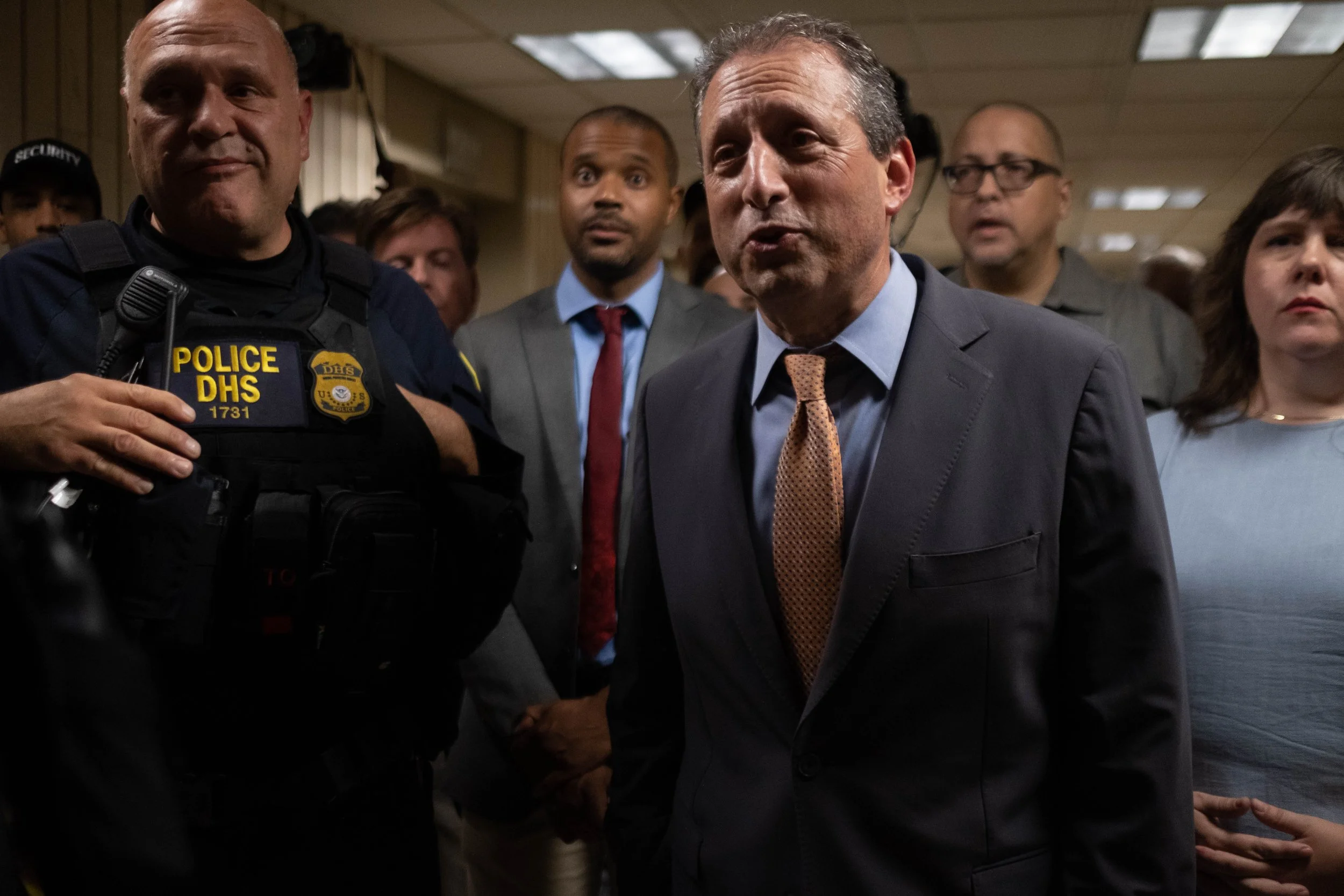 New York City Comptroller Brad Lander addresses the press in the 10th-floor hallway, directly beside a DHS officer. His formal suit and the sterile environment contrast with the unfolding resistance, as he demands transparency on the facility's conditions.