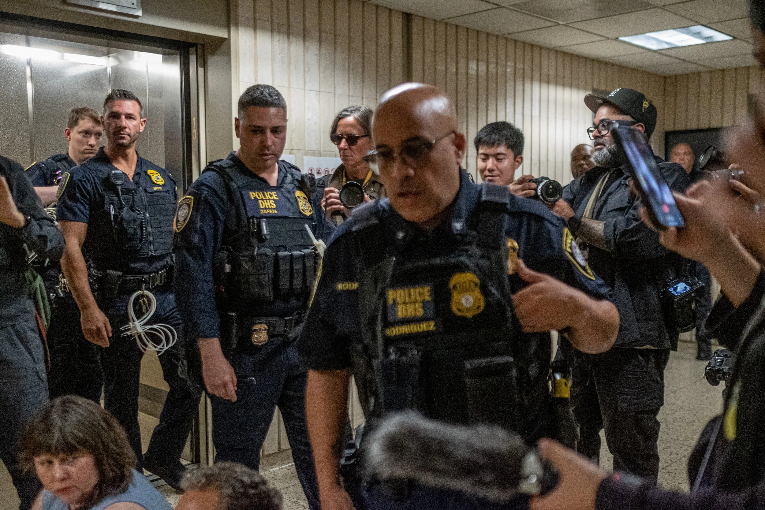 DHS Police officers move through the 10th-floor hallway as the sit-in concludes. An officer on the left carries a bundle of white plastic zip-ties, prepared for the arrests of the officials and advocates on the floor. In the foreground, Assembly Member Emily Gallagher remains seated as the law enforcement presence intensifies.