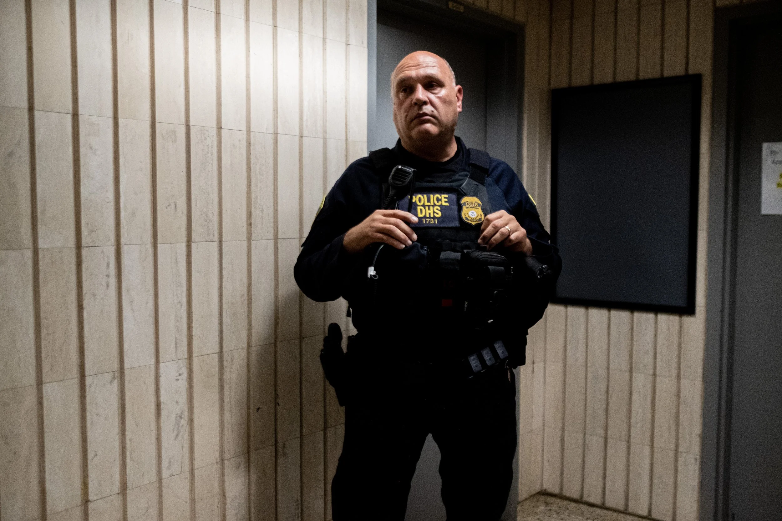 A DHS officer stands watch in the sterile, tiled hallway of 26 Federal Plaza. His presence at the center of the corridor serves as a physical barrier, maintaining the federal blockade against the delegation of local officials seeking entry to the 10th-floor facility.