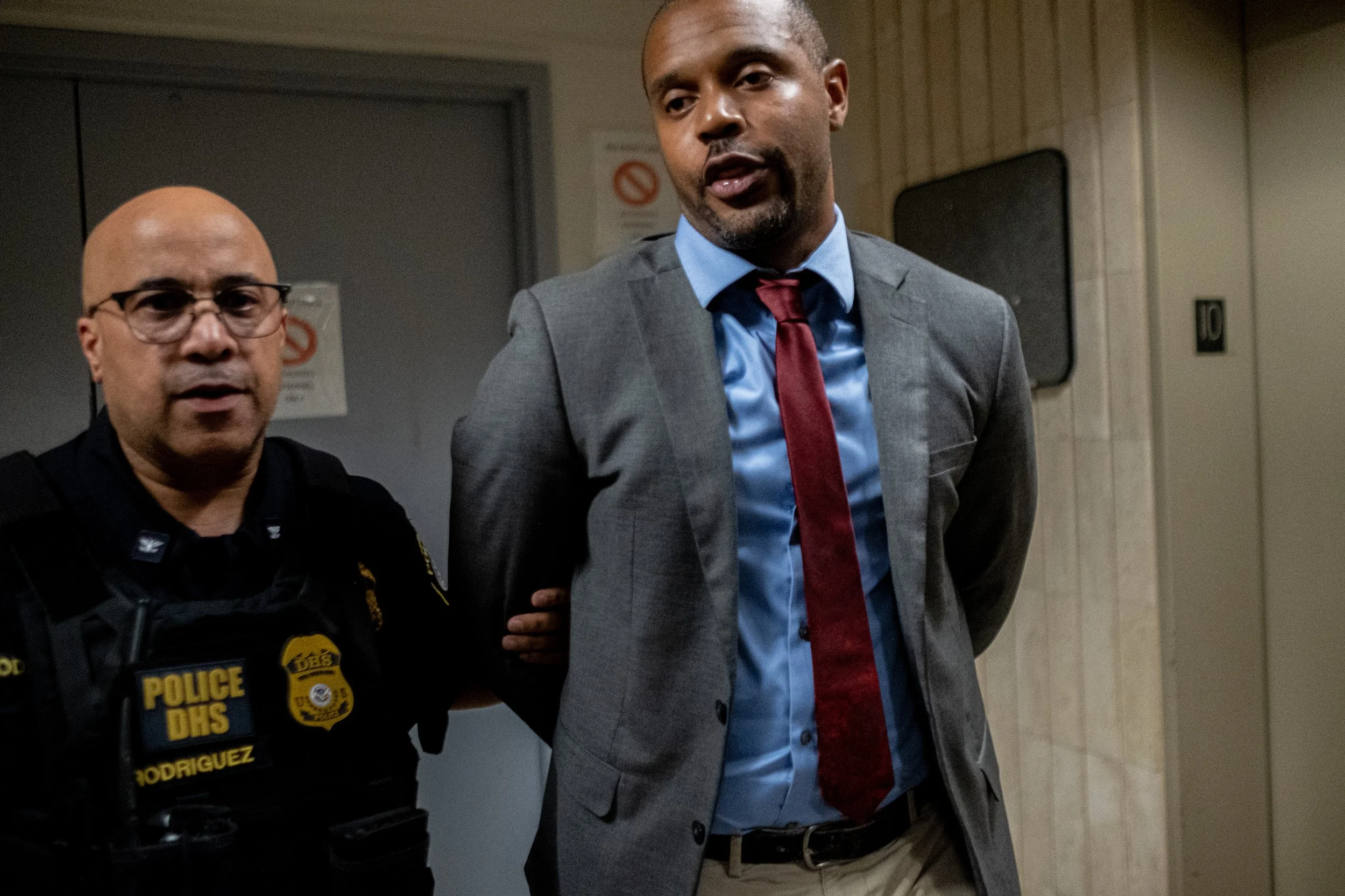 State Senator Jabari Brisport is led away by a DHS officer. His hands are secured behind his back as he is escorted from the 10th floor, following the group’s refusal to leave the corridor. The arrest was part of a larger action involving eleven elected officials protesting for transparency at the federal site.