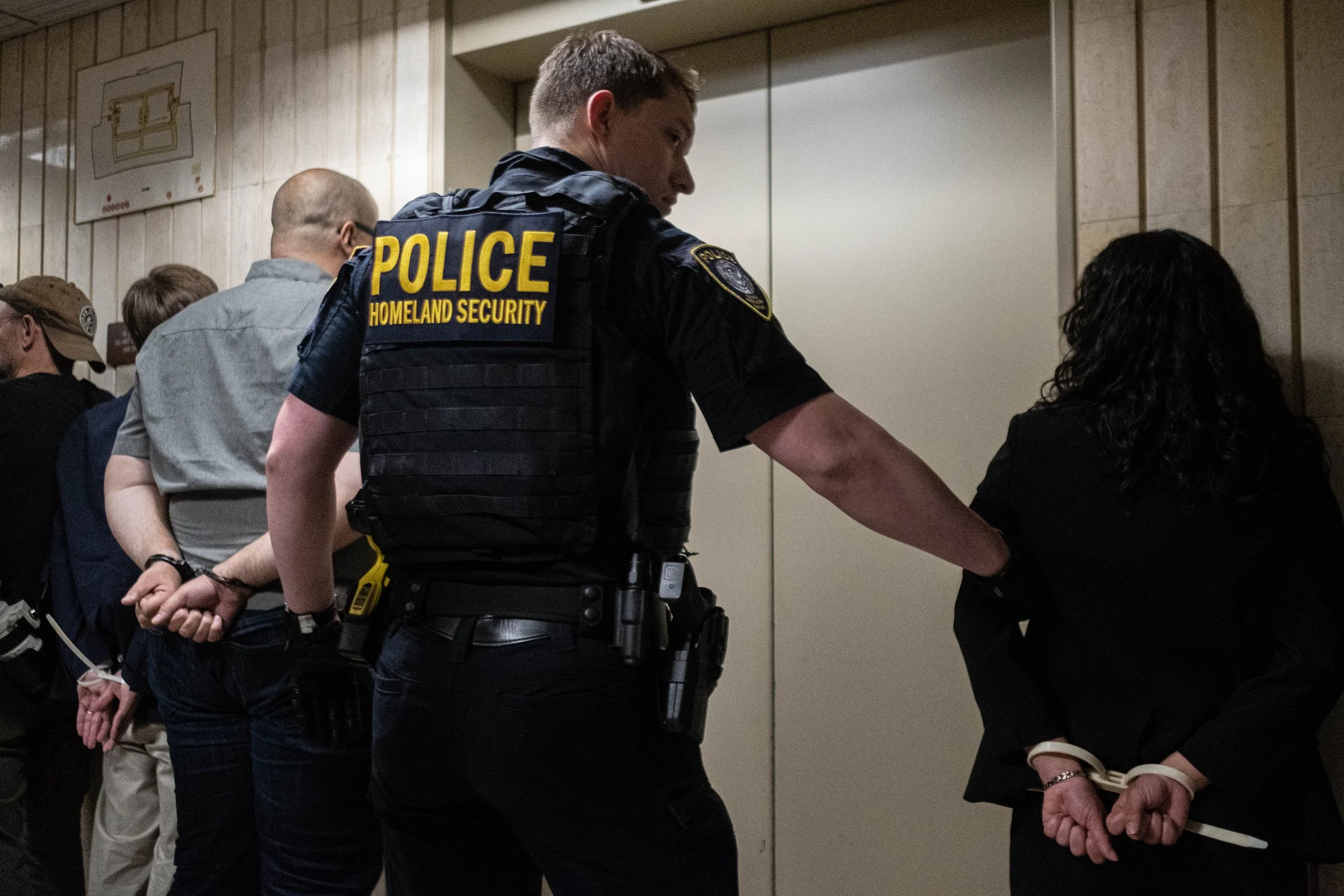 A DHS officer escorts arrested officials toward the elevators. The officer’s "POLICE HOMELAND SECURITY" patch is prominently displayed as the sterile hallway is cleared. To the right, an official stands with hands secured behind her back by white plastic zip-ties, waiting to be removed from the 10th floor.