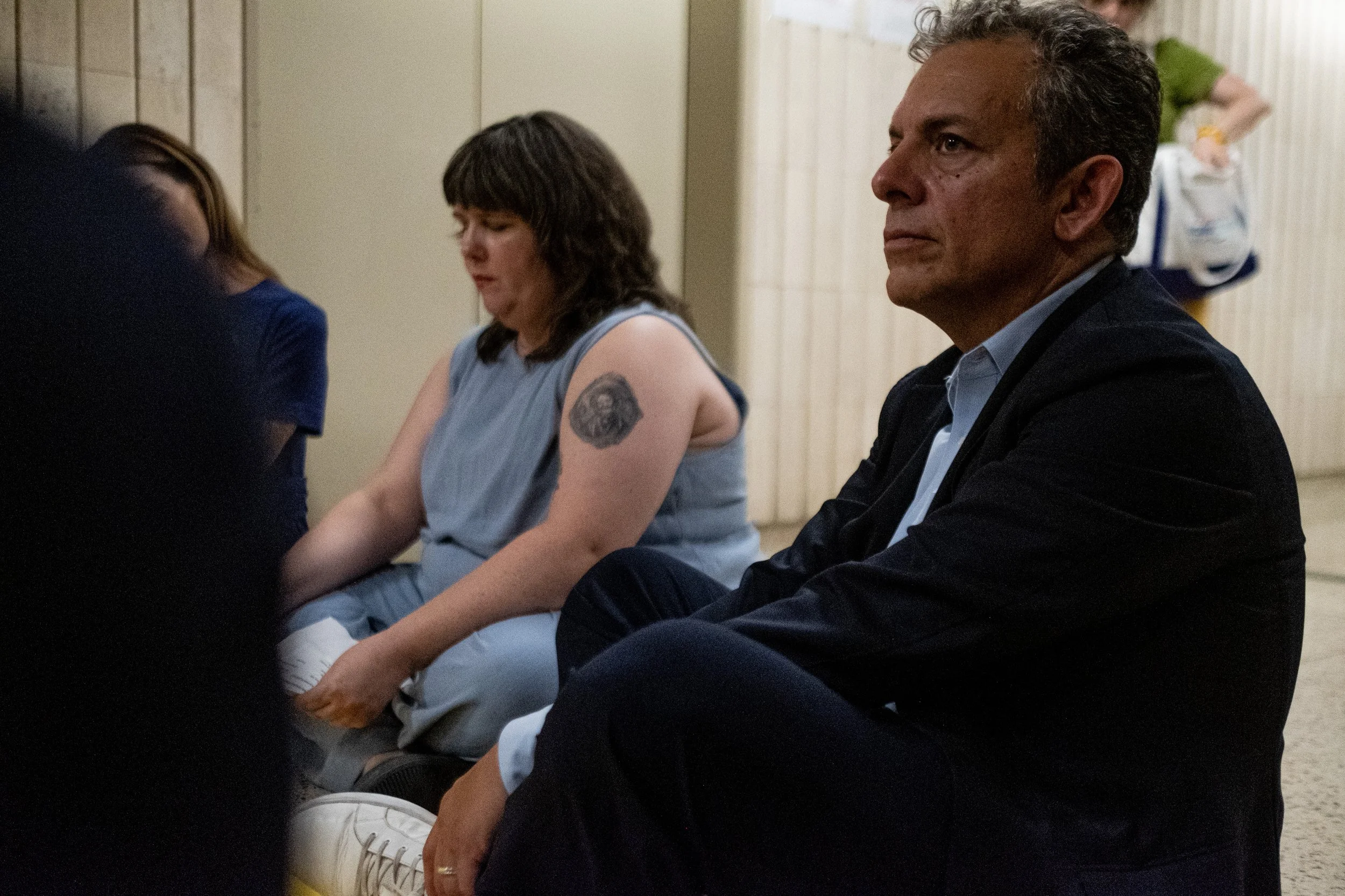 Assembly Member Emily Gallagher and Assembly Member Tony Simone sit on the floor during the occupation of the 10th-floor hallway. Their silent protest followed hours of being denied access to the federal facility, as they joined other officials in a direct demand for transparency.